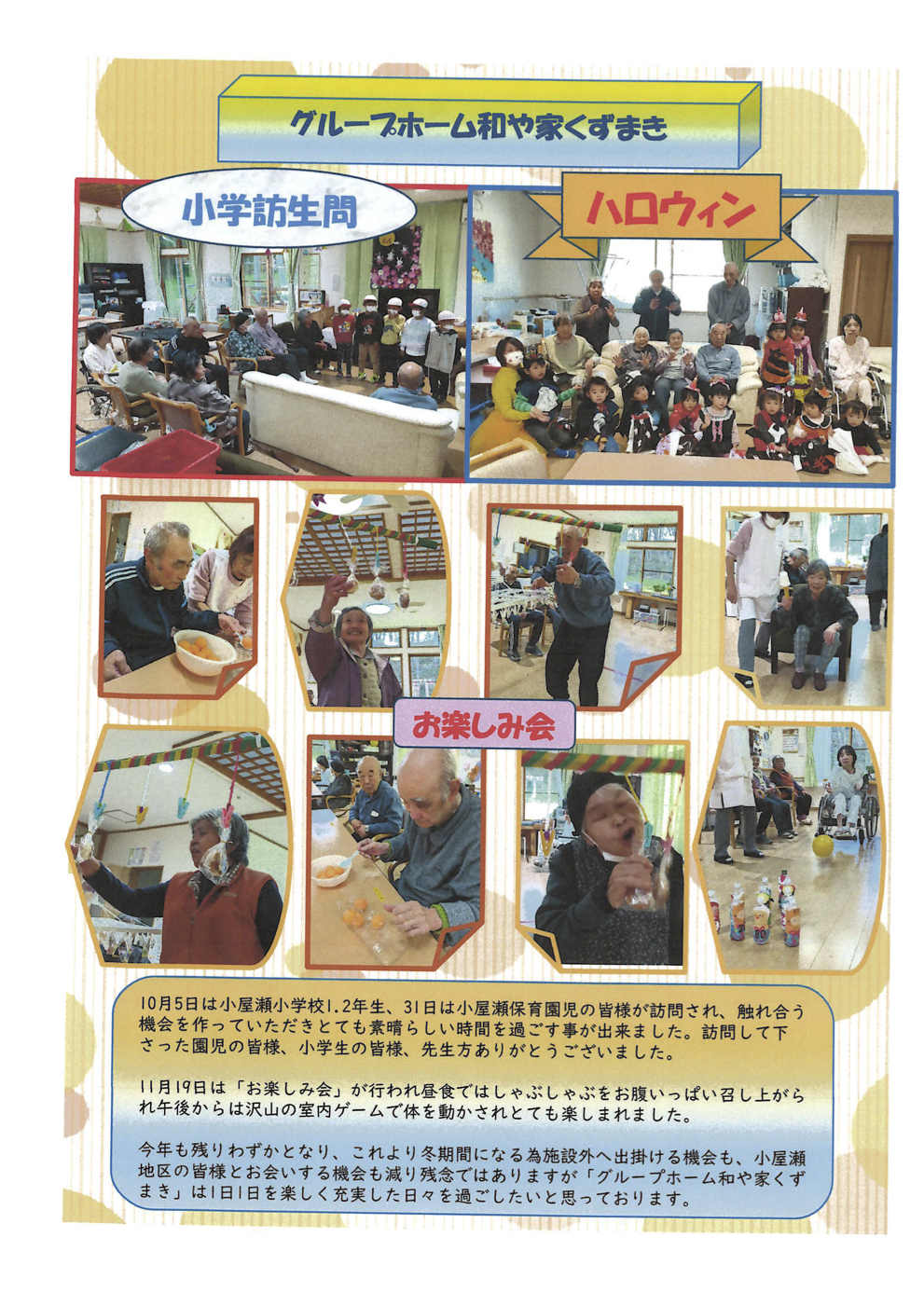 ご自宅の延長線上にある施設として、笑顔にあふれ、 安らぎの中で暮らしていただけるような環境づくりを行っています。
